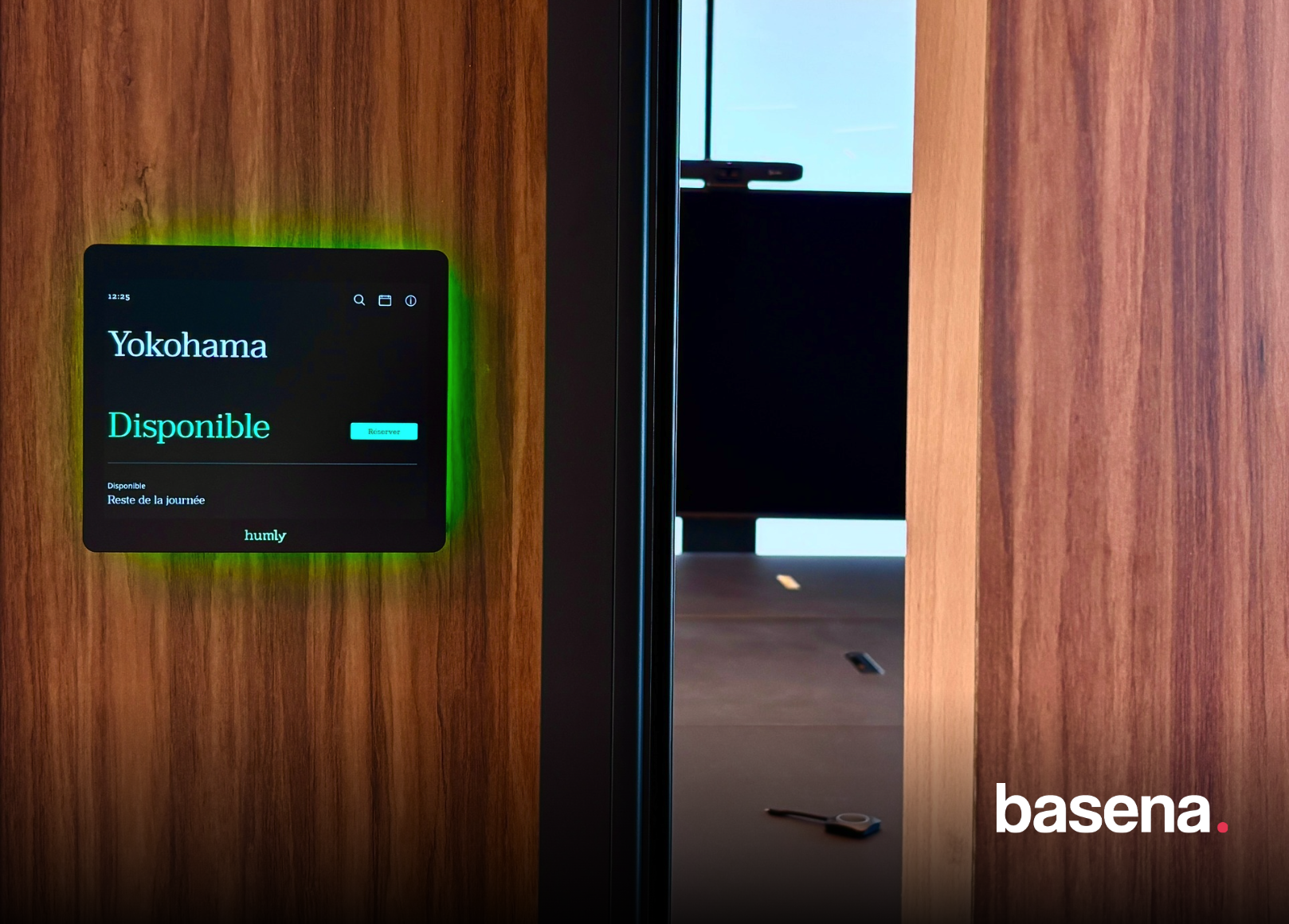 Un écran, au design soigné, s’intègre discrètement à l’entrée des salles de réunion.